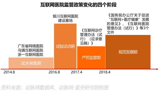 2018年4月,国家领导人先后在华山医院、银川互联网医院建设基地考察,对互联网医院的建设给予了高度认可和评价。随即在2018年4月28日,《国务院办公厅关于促进“互联网+医疗健康”发展的意见》正式对外发布,鼓励支持互联网医院的发展,行业终于迎来“定音锤”。5月,国务院副总理孙春兰视察乌镇互联网医院。随后,在9月14日,国家卫健委又发布了《互联网诊疗管理办法(试行)》《互联网医院管理办法(试行)》《远程医疗服务管理规范(试行)》三大文件,分别对互联网诊疗、互联网医院、远程医疗服务的管理做出了详细规定,标志着互联网医院已经进入规范发展阶段。