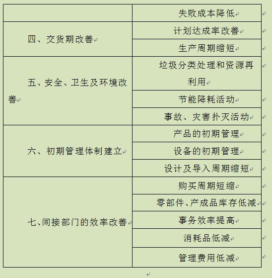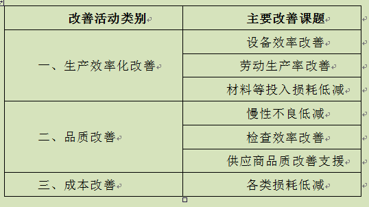 从较高的层面即比较宏观地看企业的改善课题时,焦点改善活动有以下多个方面的改善内容:
