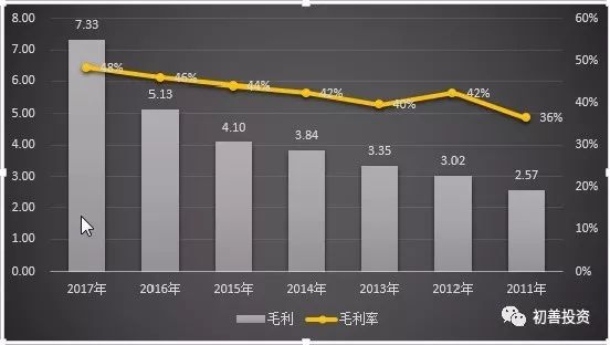 (4)看提价是否反映在毛利率上,让笔者惊喜的是涪陵榨菜的毛利率几乎也是逐年提高的。由2011年的36%增长至2017年的48%,毛利也是爆发式增长,难怪公司的净利润会如此高。如图2-21所示。