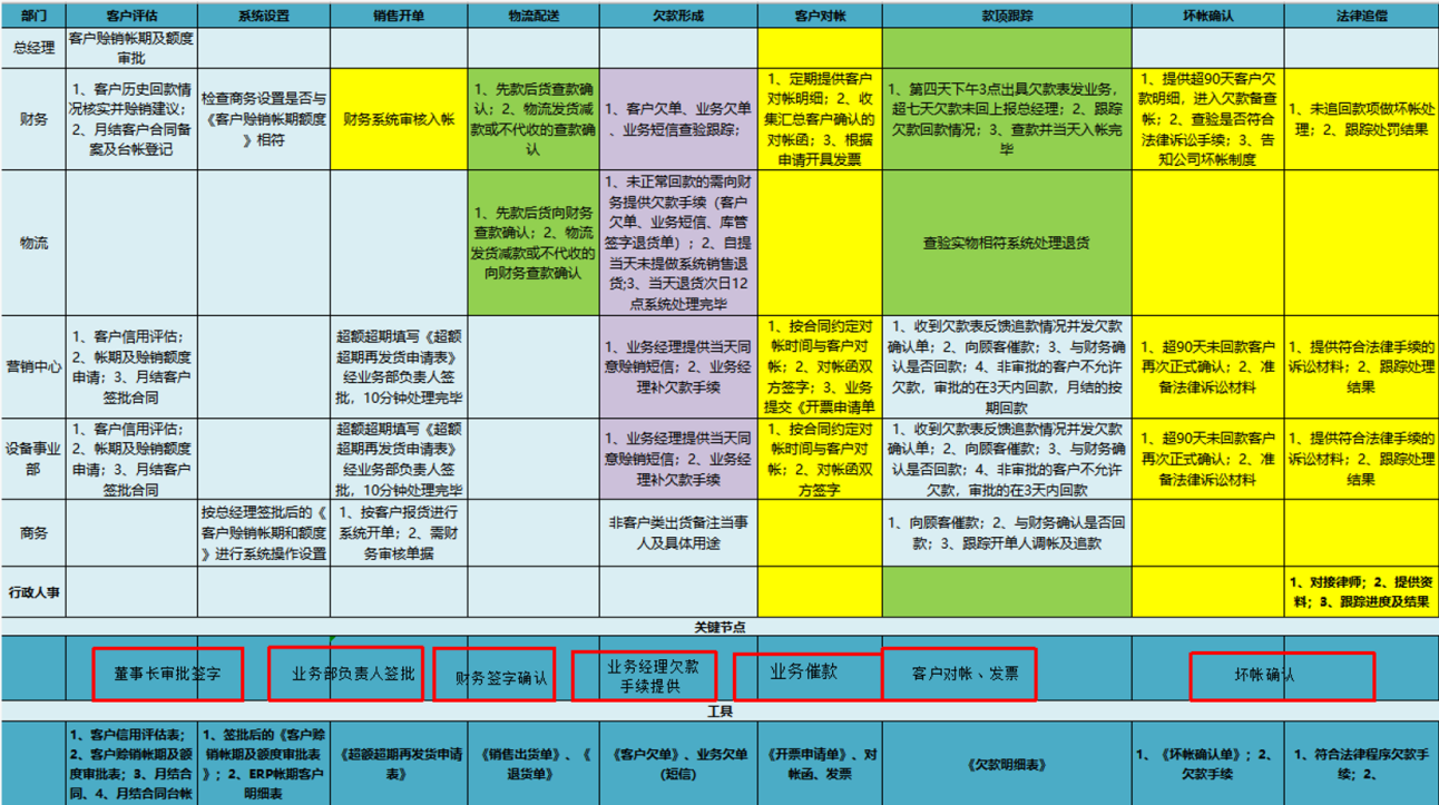 这个可以梳理成客户欠款管理IPD矩阵图,横列是欠款的整个关键管理环节,纵列是涉及到的相关部门,有关键节点和具体如求。