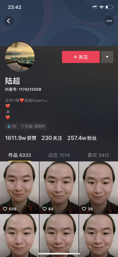 有一个网红叫作“陆超”,每天发布的视频数量高达几十个,总作品数量截至2019年3月25日,高达6101个。虽然不是每个都能火,但是却积累了257.4万粉丝(图5-31),在抖音里已经属于头部大咖了。