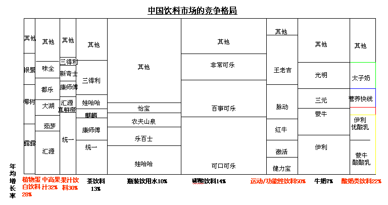 用流行的词来说,饮料市场是红海竞争为主,蓝海竞争为辅的基本现实。饮料竞争啤酒化的趋势非常明显,资本、品牌集中化、产-地-销、渠道为王等。如表2-1所示。