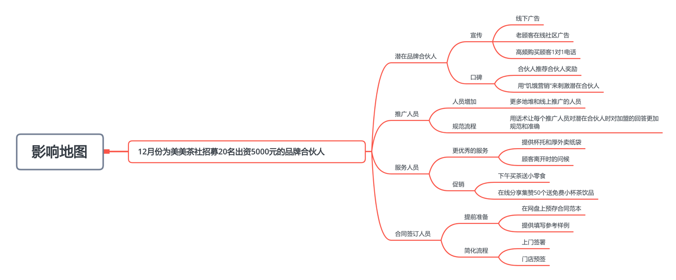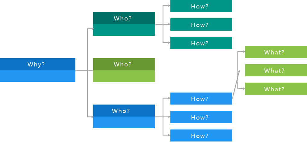 影响地图是一种战略规划方法,在产品开发期间作为组织的可视化路线图。如图7-15、图7-16所示,影响地图回答了以下几个问题: