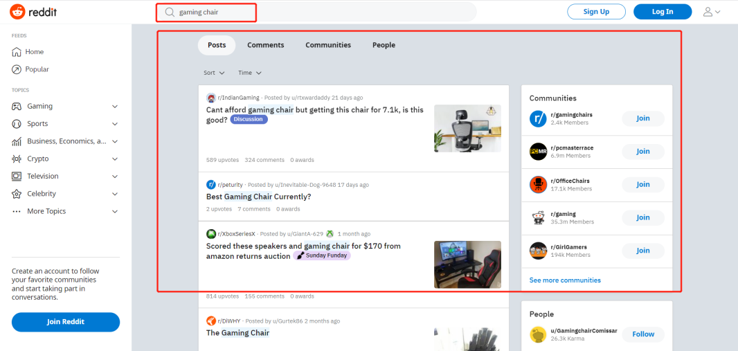 开始营销之前,要对Reddit的流量逻辑有所了解。在Reddit上,用户可以通过搜索功能找到感兴趣的产品或话题。例如,搜索关键词“gaming chair(电竞椅)”时,系统推荐了四种类别,分别是Posts/Comments/Communities/People,可以查看帖子、评论、社区、或寻找好友。