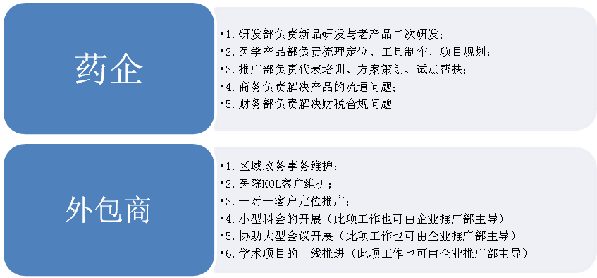 在外包商分工里,会议及项目开展也可以由企业推广部为主导,原因在于,真正拥有学术能力的外包商非常少。当然也不排除有些外包商,具备学术推广能力,这样厂家更多的则只要考虑如何支持、辅导及监督。在学术推广工作中,厂家拥有很多外包商不具备的资源,而外包商也具备厂家所没有一线临床能力,因此,最好的局面是两者携手,共同完成转型工作。