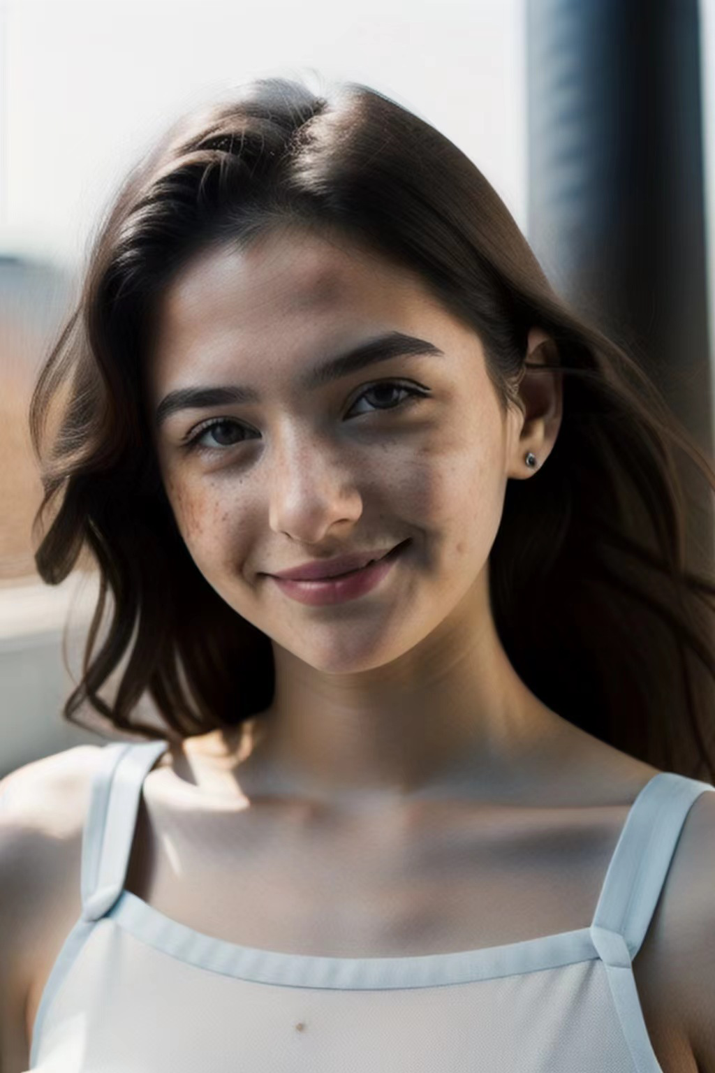 比如描述词(Prompt)在6.2.1和图6.5的基础上 ,再加上“波浪发型,脸上有雀斑,耳朵有一个耳钉”这些描述词,就会让得出的图片结果看起来更加真实,像个真人,得出的结果如图6.6所示。