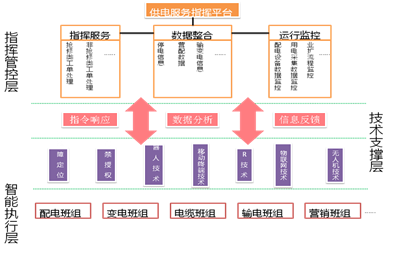 联动大数据平台,共享数据信息,使用不仅限于机器人、移动智能穿戴设备、GIS定位、AR、VR等技术手段。平台信息数据在决策层、指挥层实时共享,生产、用户数据同步推送执行层,即可满足资源调用灵活精准、指挥高效及时,执行层又可获得充分授权,弱化专业分工硬界限,侧重区域全业务支撑,引入后台专家连线,充分调动了员工为班组作业、企业责任的奉献热情,促进班组作业执行。