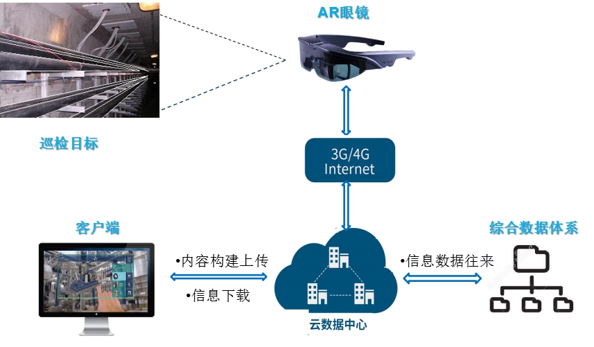 以AR智能眼镜为载体,利用其专属的增强现实特性,通过定制化开发基于AR眼镜平台的APP应用系统,实现电缆的透视化巡检。实时现场建模,将地下不可见的电缆虚拟为可见的线条通过眼镜实时显示。基于现有的电缆信息化数据和平台基础,开发具备云计算能力AR应用电力大数据支撑平台,为AR眼镜的应用提供计算和数据保障,实现远程设备基本信息和实时信息的全息化投送、远程协助和第一视角交互、人员管理和定位、故障和巡检结果数据分析等应用,提高电力巡检作业的工作效率、安全保障能力和专业水平。