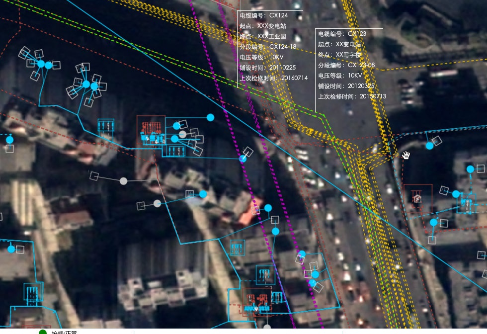 将开发基于AR平台的APP,能实现电缆专业管理范围内的电缆电子地图调用和显示能力,电缆图就像道路图(类似高德地图)一样,由带坐标的电缆数据进行地图化建模,可以平滑缩放(矢量图),并具备位置服务的能力。巡检人员可通过AR自带的GPS或者北斗芯片等进行初步定位(误差范围10米以内)并借助现场设置的物联网标签(Marker,一个或多个)实现精确定位(0.5m以内),在此基础上,AR眼镜端APP可以从云平台调取相关的管线模型,并通过虚拟叠加,实现电缆的“透视”,如果同时读取相关的数据信息,也可以通过AR眼镜的全息投影技术直接在电缆模型上进行数据和信息的显示和交互。最终发展方向是通过AR眼镜能实时以2D+3D方式显示任何地点的所有地下电力管线信息。