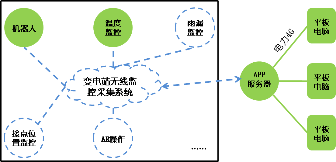 在变电站内设置“无线监控采集系统”,将部分告知类信号、部分原来不能采集的信号收集到采集系统服务器,再发送到现有的APP服务器,通过电力4G无线网络传送到运维人员随身的移动终端,实时远程监视、控制站内部分设施。可选择扩展监控功能设想包括:智能巡视机器人远程遥控、设备温度监控、屋顶雨漏实时监控、粘鼠板智能告警、消防误告警监控核对、AR智能五防系统等。