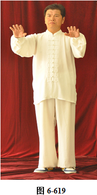 接上式,腰微微向左右两侧撑,随撑随里外转腕,使双手心朝外,平拉按开,与肩平宽;腰缓缓下沉,微后倚,带动两手缓缓向前下按,似凭栏下望。一直下落按于胯前 随即自然垂于胯两侧, 眼神自然向内收敛(见图6-619至6-620)。