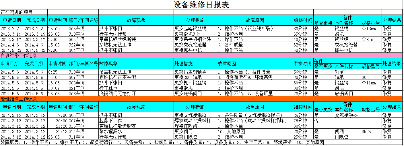 因为设备故障数据库基础数据来源于设备维修报表,所以设备维修报表的数据格式是否完备,以及各设备负责人员是否依要求完整填写决定了设备数据库运作的成败。