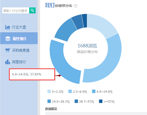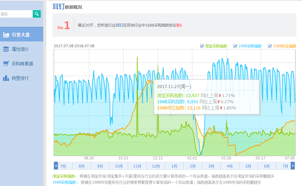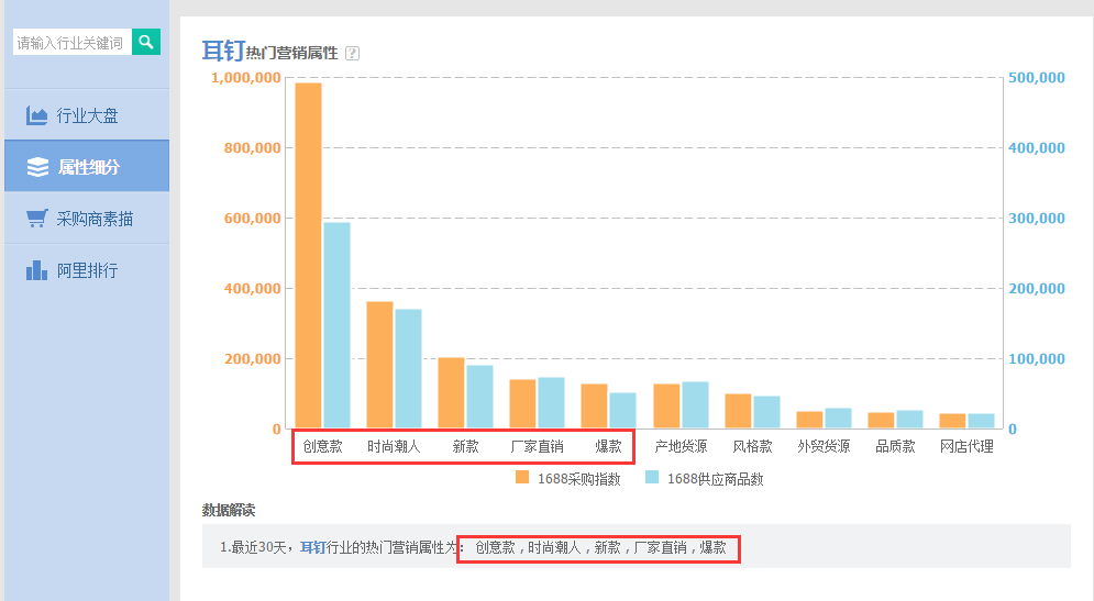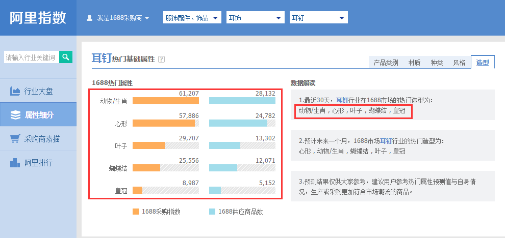 我们来看阿里指数里面的属性细分,得出:30天耳钉行业类别为耳饰。如图1-5所示。