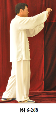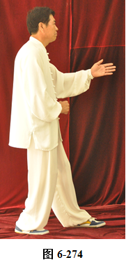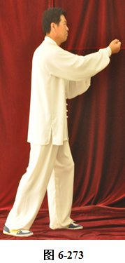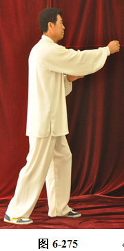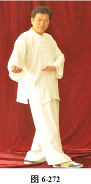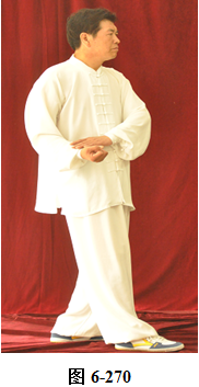 接上式,腰微含,向右外转,身体随之慢慢向右转。随转体右拳带左掌转向右肋旁而上, 经胸前向前划弧搬出。随搬臂外旋,拳心慢慢翻转朝上;腰向后微拱,随即右臂渐渐向怀里弧形抽回, 重心渐渐移落左腿。左掌也同时随转体划弧形向右经右臂里侧前拦,掌心朝右,眼神观注前方;左腰上提,左脚随之前上一步,腰微含右转,身体随之右转,随转体左掌向前探出;腰上提向左旋转, 探出的左掌变为立掌,掌心朝右,右拳弧形收回腰际,拳眼朝上(见图6-267至6-275)。随重心渐渐移于左腿,成左弓步;腰上提,右拳向前打出,左掌指尖朝前上,置于右小臂内侧,眼向前平视。