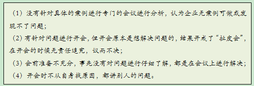 :我们在XN公司推行案例分析会时,面临的问题有以下四点:第一,以前就没有针对具体的案例召开专门的会议进行分析,大家认为企业无案例可做或发现不了问题。第二,有针对问题进行开会,但开会原本是想解决问题的,结果开成了“扯皮会”,开会的时候无责任追究,议而不决。第三,事先没有对问题进行仔细了解,都是在会议上进行解决。第四,开会时不从自身找原因,都讲别人的问题。所以我们对案例分析会有一项规定,站到台上检讨问题,不允许讲别人怎么影响你,只能讲在这个事情这个问题里面你做错了什么。