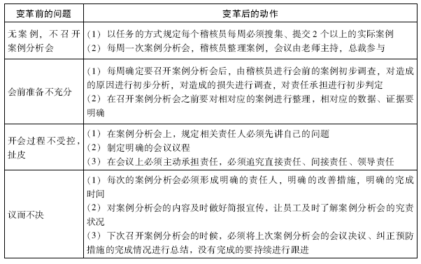 针对开会议而不决的问题,项目组推出的变革动作是:第一,每次的案例分析会必须形成明确的责任人,明确的改善措施,明确的完成时间。第二,对案例分析会的内容及时做好简报宣传,让员工及时了解案例分析会的究责状况。第三,下次召开案例分析会时候,必须将上次案例分析会的会议决议、纠正预防措施的执行情况进行总结。这些措施有没有做,做到了多少,目前是什么情况,要在会上进行通报。
