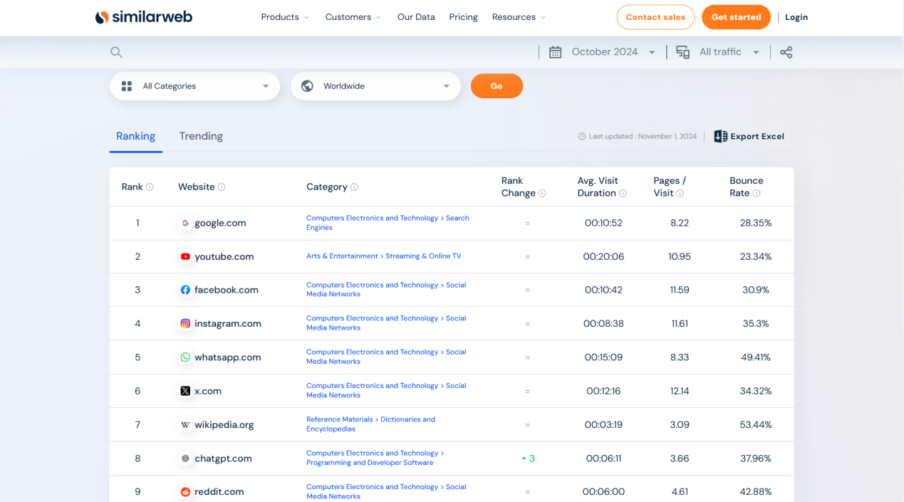 功能亮点:提供全球和国家级别的网站排名,帮助企业了解目标市场内各个网站的流行度和影响力。还有关键词分析和受众分析功能。