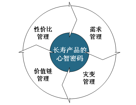 心法是长寿产品的心智密码,方法包括创造长寿产品的四个方法:性价比管理、需求管理、灾变管理和价值链管理。