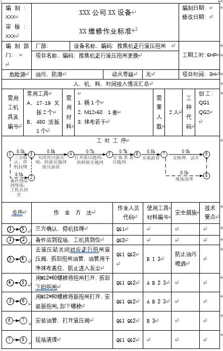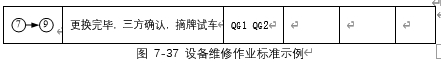 维修作业标准具体如图7-37案例所示,应包括维修作业资源投入(人、机、料、时)、维修步骤顺序、各步骤的工作方法、工具以及标准要求等。