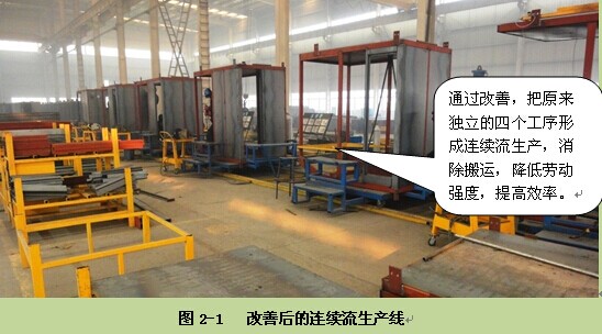 实现连续流,重点是尽可能地将生产流程连起来,从第一个工作流程(或工序)开始到最后一个流程(或工序)结束,实现连续流动,中间不设仓库和中转站,减少了搬运人员;由于前后流程(工序)是统一计划、统一管理,生产的一致性较强,减少了等待浪费,因此提高了生产效率,缩短了制造周期,同时也减少了管理成本。