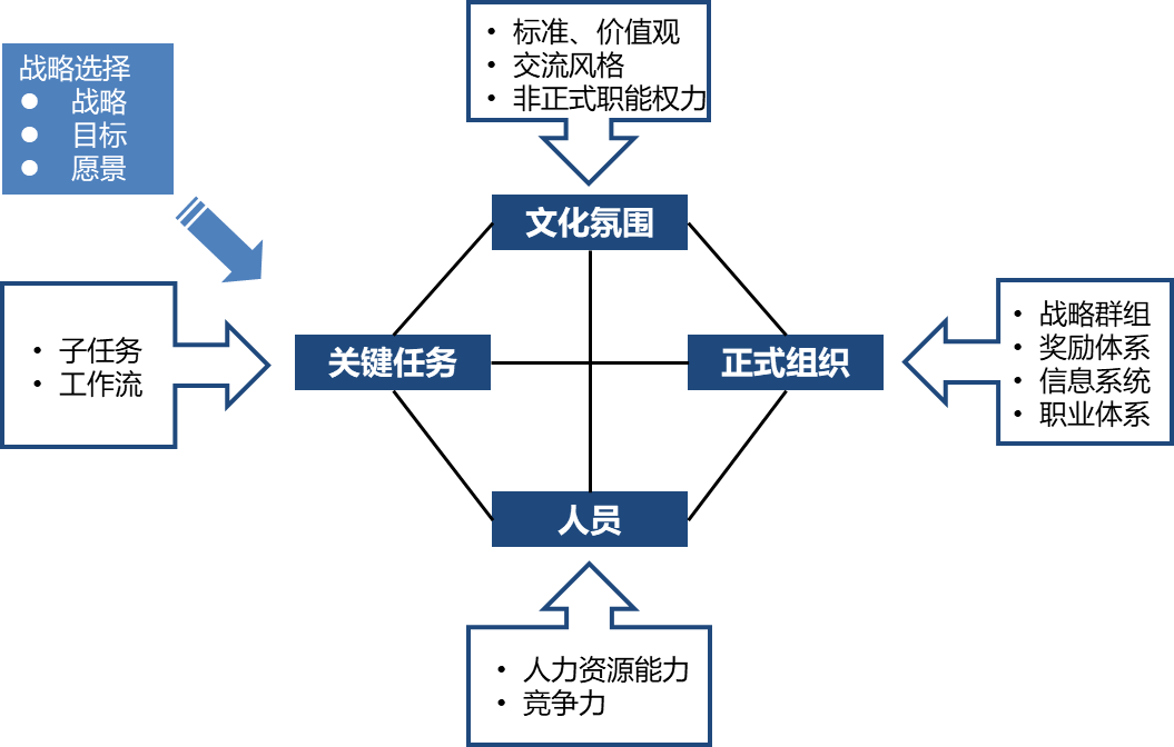 (3)企业文化与关键任务不匹配。某公司成立20多年,一直以OEM代工为主。新的关键任务是搭建自己的营销网络并推销自主品牌产品。公司多年的企业文化强调卓越品质和权力集中,然而新的任务需要的文化氛围是速度、主动性和团队合作。可公司领导人并没有意识到需要进行文化变革以激发内部活力,导致公司转型失败。