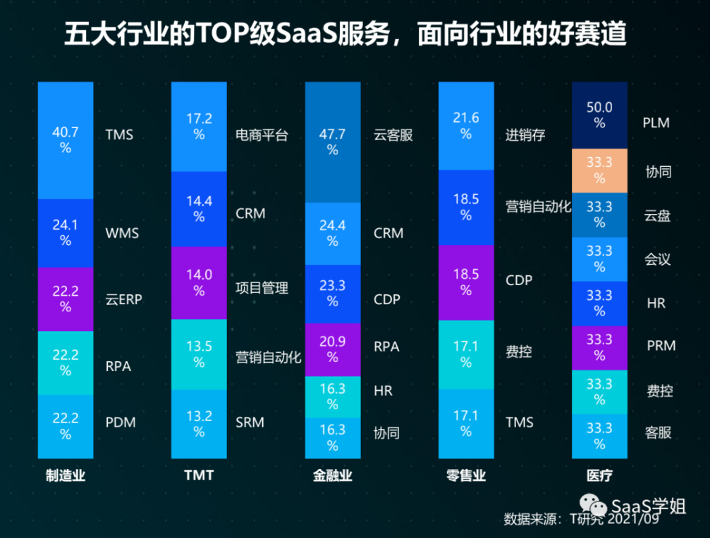 而在中国SaaS发展的这12年,仍然聚焦在5大行业,图1-8所示,行业中的赛道仍然也有较高的重复度。这种扎堆挤的现象,笔者曾经在SCRM领域亲历过。随着中国经济从快车道进入了稳步发展的时期,再加上微信使用人数节节攀登,不少企业从内部管理转向赋能销售,从2020年开始,SCRM疯狂冒头,一年至少有几十家新企业进入市场,到现在搜索“SCRM”,一时之间市面上有调查的同类公司超过3000+家。