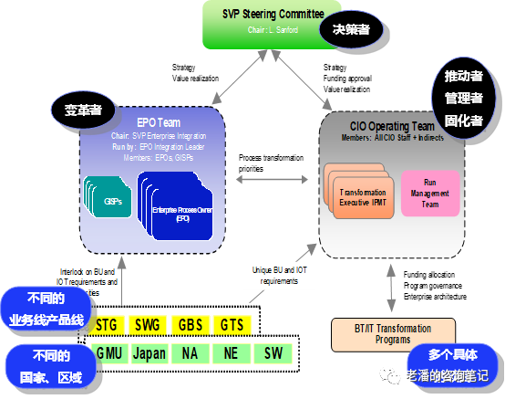整个这个结构的第一个关键点是Transform这个组织/团队,由这个团队来策划、指导、推进、协调各条线的转型,包括具体转型项目的管理,第二个关键是CIO,通过CIO纵向拉动IT资源进一步承接变革转型的信息化落地,同时通过CIO的职位与各流程所有者、业务和区域leader们沟通协调推进。