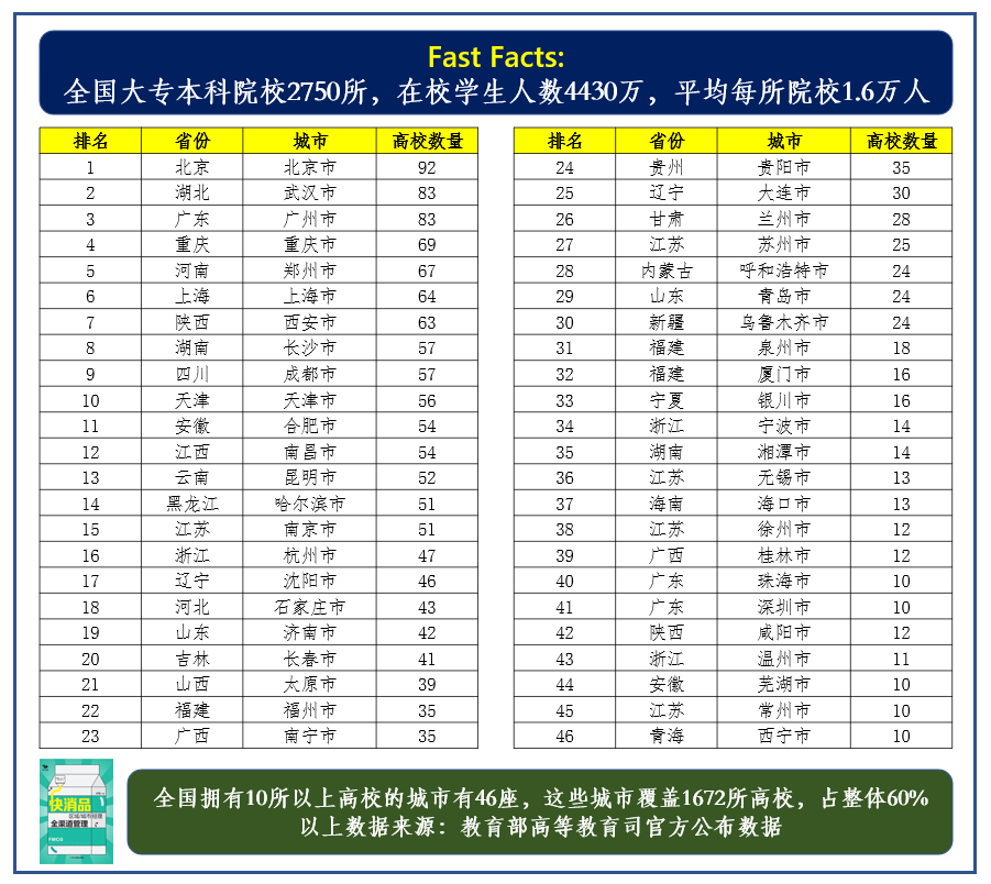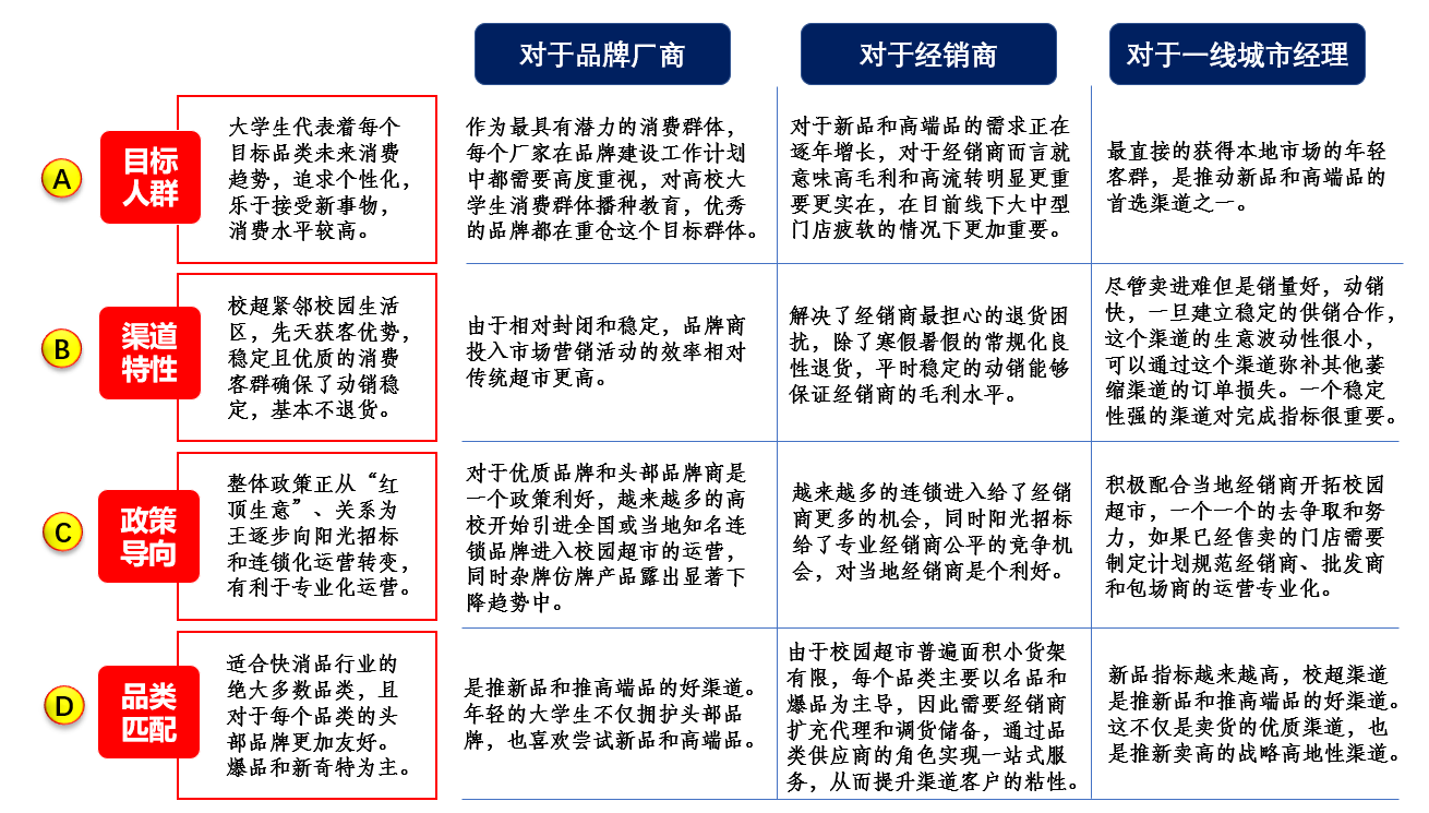 从品类匹配分析:吃喝玩乐对于在校大学生一样都不能少,校园超市可以匹配快消品厂商的绝大多数品类,更重要的是这个校超渠道是推新品、推高端品、推小众品的试验田和桥头堡,各个品类的品牌商都应该重视对这个渠道的投资和推动。对于本地销售团队而言,开拓并提升这个渠道是当下必须要做的,有疫情时临时抱佛脚要上,平时没疫情更要上!
