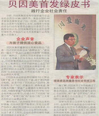 20081111,“贝因美16周年庆暨第四届育婴专家节”如期开幕。1118在贝因美婴童生活馆(北京)全球概念店发布《中国婴童行业首部企业社会责任(CSR)绿皮书》。