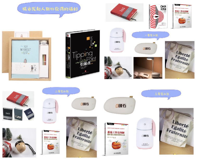 首先,设立了两个与暖石相关的大礼包,分别针对活动发起人和参与活动的暖石同学。主要包括台灯、本子、书籍等。如图8-6所示。