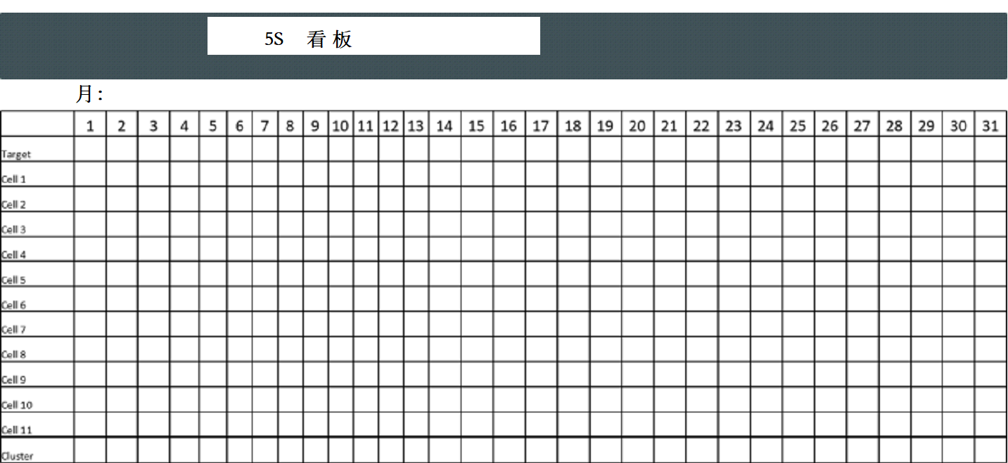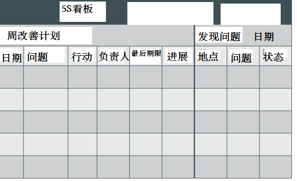 整个工厂被分成大区域,每个区域设置一块看板,对于每个检查区域由相关的负责人按照检查表进行审核并打分,把打分的结果公布到管理看板上,每天公布发现的问题和责任人,并且就暂时不能解决的问题给出行动计划,包括行动的内容、完成时间和责任人。