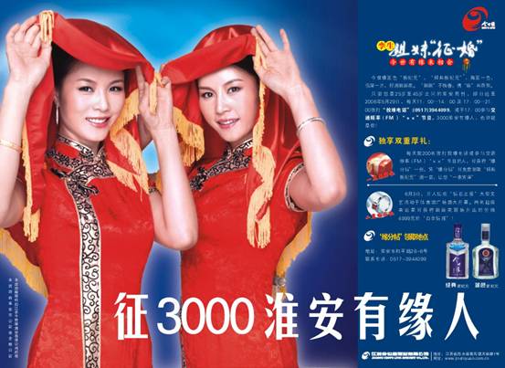 第二阶段:解密报料,火爆征婚。以“征3000淮安有缘人”为主题把“孪生姐妹征婚”这件爆炸性的事件进行为期两星期的报料,并结合产品免费赠饮活动同步推广。活动明为“孪生姐妹征婚”而实为经典新纪元免费派送活动,实现明暗结合。此时电话及电台征婚正式启动,产品免费赠饮火爆进行。如题为“孪生姐妹征婚大揭秘”、“孪生姐妹齐征婚——送美酒赠美钻乐翻淮安男”的软文同步进行跟踪报道。如图9-9所示。