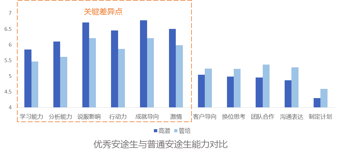 Step1:数据收集与分析:选取往年快速成长的高潜安途生,完成大五人格职业性格测试,把高潜安途生和普通安途生的数据进行对比,选出最具代表的关键差异点。如图12-13所示。