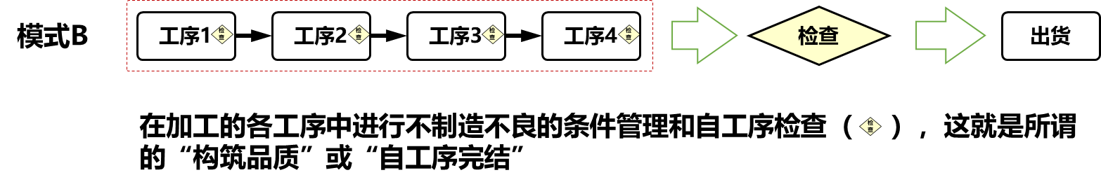 要实现在工序内造就品质,就要确保良品条件,由重视检查(结果)的做法转向重视过程和原因的做法。在工序内造就品质的相关工序中,只有加工各工序使原材料发生一系列类变化,成为产品,提升附加价值,搬运、保管、检查等各工序也并不是与品质无关,要承担不使品质恶化的义务。
