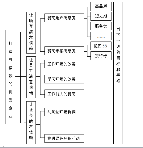 以上纵向目标体系,只列出了前面的几个层次,实际上目标要落实到执行者身上,还需要进一步细化。比如,为了达成“高品质”目标,在具体明确品质标准的基础上,从物料供应、品质检查、生产制造、技术支持等各个方面出发,深入细化下一层次的具体目标。