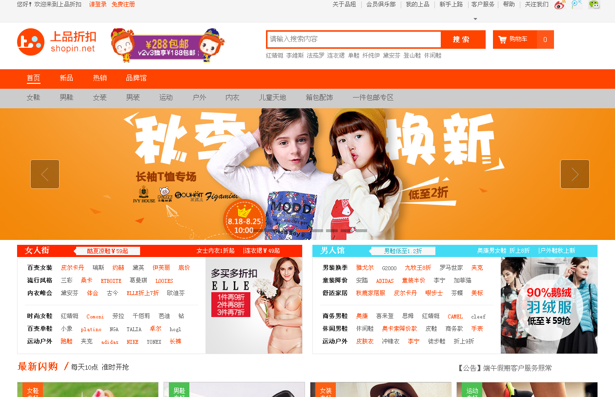 上品折扣网与实体连锁店同步推出应季新品、统一价格销售。旨在以更便捷的购物方式、更快速的配送服务,更广泛地面向全国消费者,让中国各个区域的时尚一族,同步得享高品质、高性价比的潮流商品。