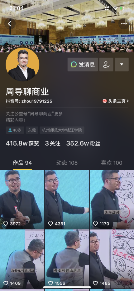 很多教育类账号在抖音平台发展很快,有一个账号叫“周导聊商业”(图7-7)。周导在2018年之前做了六七年的培训,之前效果不好,主业是帮企业做企划案,收费是一年120万元。后来通过抖音,他快速吸引到300多万粉丝,现在每个月开1~2场培训,每场每人费用9800元,每场人数1000~2000人。所以现在每场培训收入有1000万~2000万元。这只是三天两夜课程,然后会有30%的学员继续上高阶课程,按每人10万元的费用,可以想象变现能力多么强大。