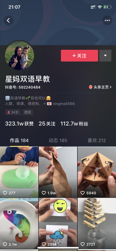 有一个账号叫作“星妈双语早教”(图7-8),把国外的视频用中国方式演绎一遍,主要内容是教父母如何做一些与学龄前的孩子进行互动的游戏或道具,5个月时间粉丝从零到90万,现在已经一百多万了。