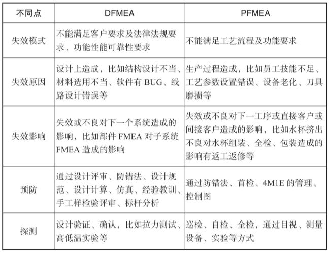 DFMEA是产品设计FMEA,包括系统设计、子系统设计、部件设计,是由客户和法律法规要求转化为产品功能性能、可靠性、结构、外观要求。比如一个水杯,客户和法律法规要求是能装多少毫升的水、材质要求、环保要求、外形要求,系统FMEA从这几个方面来做失效分析,找到设计改善要点。PFMEA研究的是工艺流程的失效,比如水杯,工艺流程是原材料—仓储—挤出—丝印—盖盖子—包装—仓储—出货,PFMEA是从工艺上找失效,能满足客户及法律法规要求,而且假设设计和上工序半成品没有问题。DFMEA的失效原因是从设计上寻找,PFMEA的失效原因是从人、机、料、法、环、测上去找。如表1-4所示。