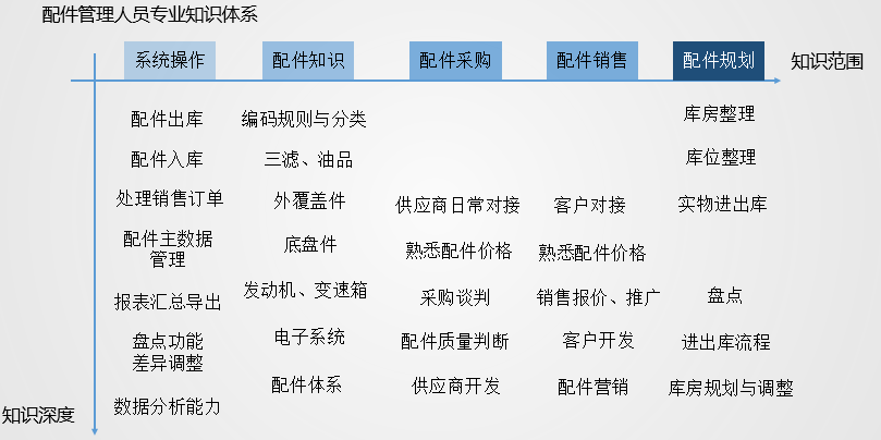 根据数年来对配件工作岗位的辅导经验,我们构建了配件人员专业知识体系模型,如图4-2所示,供读者参考: