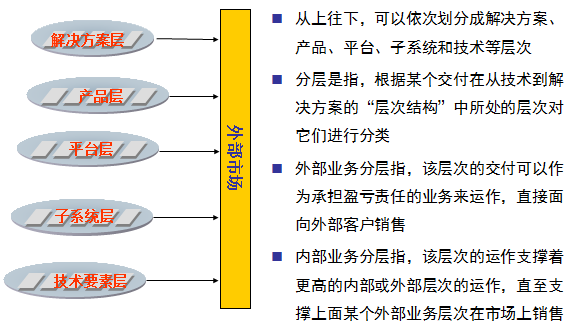 在一个分层里,产品包是按市场进行细分的。每种业务都应该在公司内外寻找市场。在公司内部,这些业务将提供一条“食物链”,把低一层的产品包及时、具有竞争力地交付给相连的更高一层。