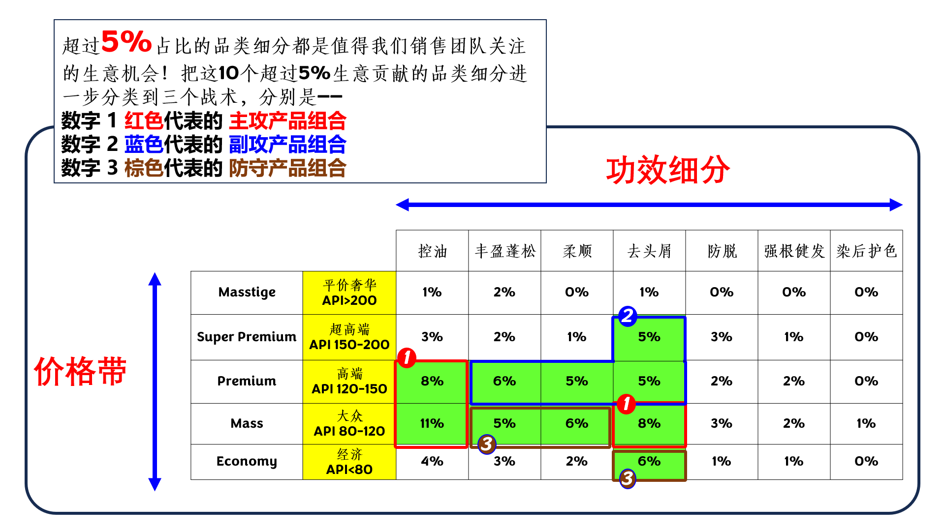 “王总,超过5%生意占比的洗发水细分类目一共有10个,这10个又同时涉及四个价格带和四个功效带,我想如果同时聚焦10个工作重点,那不就没有重点了吗?”小王疑惑地问道。
