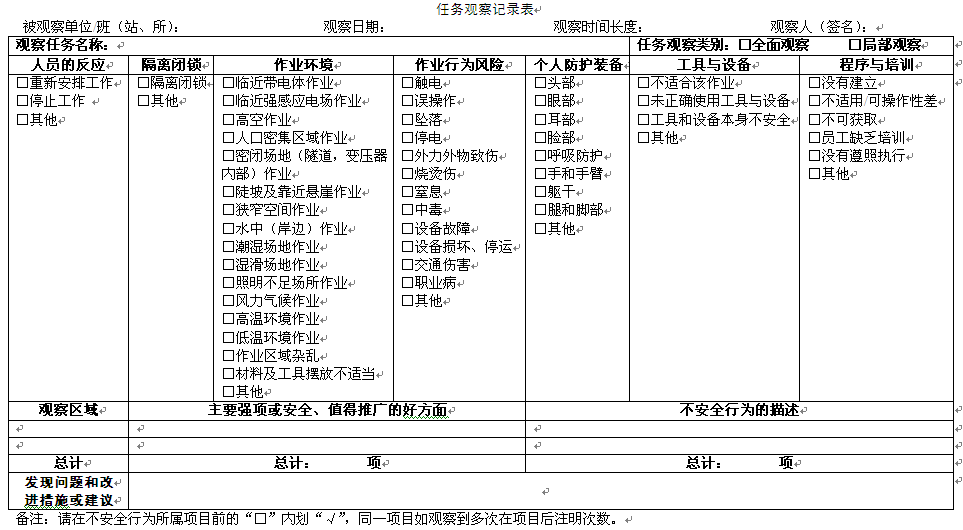 任务观察是指对观察人员抱有某种期待或是对照某个标准,对作业任务进行观察,从而实现某种目的。安全任务观察的目的有:了解员工的工作习惯;检验相关标准与作业文件的全面性和可操作性;跟踪员工培训效果;收集员工的培训需求和合理化建议;发现可能导致事故/事件、伤害、损失和无效率的行为和方法。