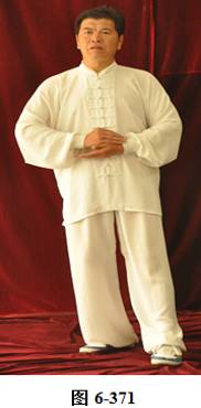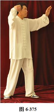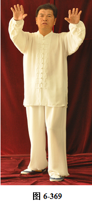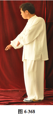 接上式,腰上提向左旋转,身体随向左转动,眼神随之向左看。挤式不变,随身向左转至正南,向上方穿掌, 右脚随之内转, 脚尖朝向南; 腰微拱,穿掌的两臂顺势向下採,重心落于右腿,呈微倚式; 腰向右外旋转, 身体稍侧向西北, 两臂随之翻转向右后,两掌指尖斜指向地面,掌心朝下。左掌落置右肋旁,右臂舒伸直落置右胯后侧;左腰上提,左脚外开,脚尖转向正南,与左肩平行;右腰上提,带动两臂平弧向正南,成左弓步;腰向左拱撑,两臂向左下划大平弧,重心移至右腿;两臂继续向下划弧,随重心转移后倚收回腹前,呈两掌相对微合在一起(见图6-367至6-377)。腰微拱旋转向右,身体带右肘随之微转向稍西北,打出右边肘;腰回转微含,随之上提,右臂顺势向右外斜上方平送打开, 右掌变勾手,略高于肩。左手仍置腹前;左腰微拱向左外转,提左膝, 左脚向左前上方迈出一大步,身体转向正东。左腰继续上提,左臂随之向前掤出。右脚随身内转,脚尖朝向东南,呈大左弓步;腰微拱,身体稍后倚,将左掤出的手掌顺势向内旋翻,掌心向下採按至腹前。腰随即上提,左掌随向左前上方掤推。