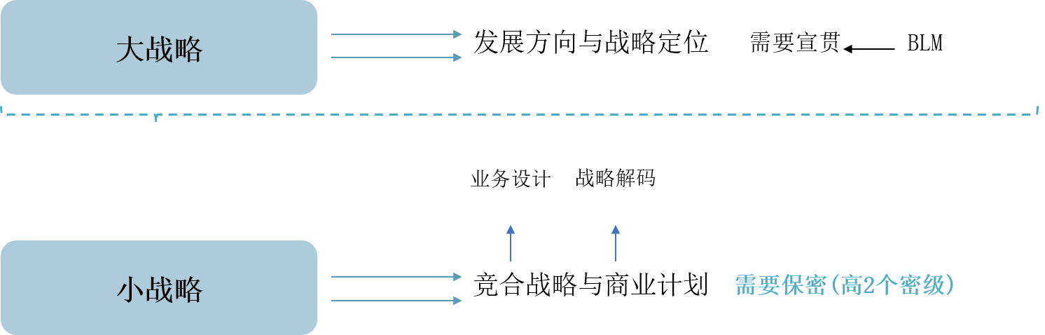 国家、区域、政府、组织甚至个人都有战略,本书谈的主要是企业战略。在咨询实践中,笔者经常把战略区分为“大战略”和“小战略”(如图6-1所示)。“大战略”是公司的发展方向与战略定位,是需要宣贯,也是可以公开的,要对员工、供应商、消费者讲(战略制定之后,不能锁在保险柜里,有些内容需要“广而告之”。有意思的是,在战略宣贯方面,国有企业做得远远比民营企业要好)。“小战略”是竞合战略与商业计划,这块是需要保密的(很多上市公司并购某家企业,内部的人和外部的人一样,也是等公告出来才知道)。笔者经常和首席战略官们交流,不少CSO认为竞合战略要比商业计划高出两个密级,笔者是同意这个说法的。