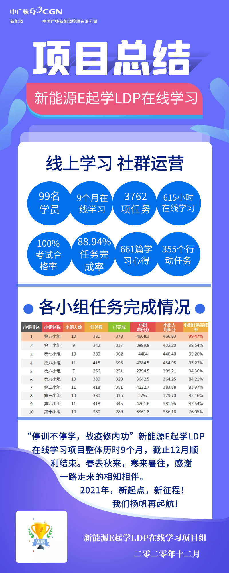 接下来看看优秀小组。第五小组以综合任务完成率99.47%排名第一,授予“优秀小组”的称号。