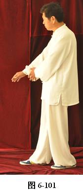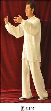 接上式,腰微拱,重心渐渐移至左腿,右手随重心转移向左下腹划弧捋至左肋旁。手心翻转向上,左手随腰拱,向外上方划弧翻转掌心向下,高与肩平,成左抱球状。右腰上提,右脚随即向前迈出小半步,右手臂上翻向前打掤(见图6-100至6-107)。