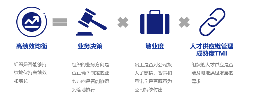 要实现高绩效均衡,我们必须知道达到高绩效均衡需要什么条件。根据我们2018年人才供应链的调研2(倍智人才研究院于2018年重点调研了156家企业,分析其人才供应链建设情况,并发布了《2018年度中国企业人才供应链管理成熟度白皮书》,以下均简称白皮书),要实现高绩效均衡关键有三点:第一,企业要有正确的业务方向,业务战略方向是正确的,而且能贯彻执行,也就是业务决策是否正确;第二,企业有持续的发动机,是业绩倍增的前提,发展有动力,也就是员工敬业度高;第三,企业要有能力机制,能够满足组织需要的人才供给,也就是人才供应链管理成熟度。如图1-4所示。