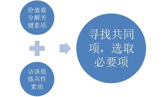 首先,根据价值观的内涵,分解出核心文化需要具备的素质;其次,通过访谈优秀员工,提炼其共性素质;最后,把二者结合起来,寻找共同项。如图10-4所示。