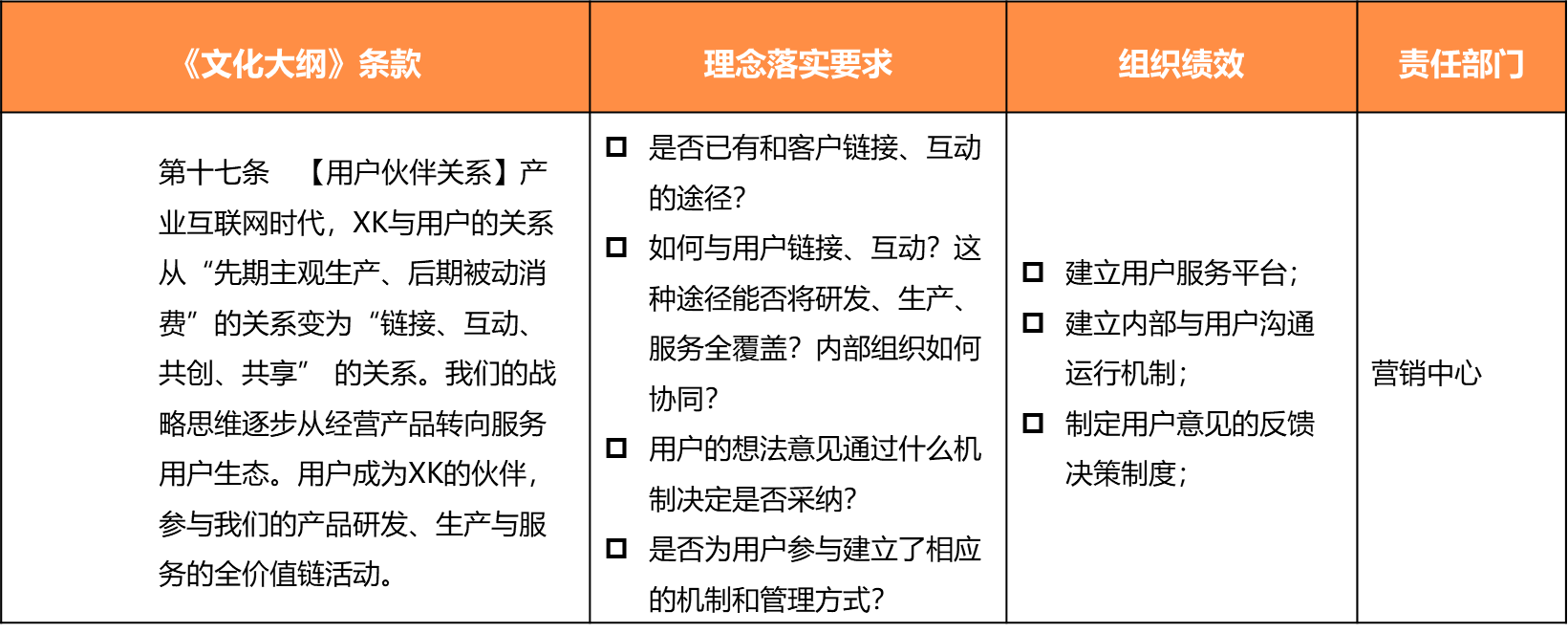 企业文化理念内化的核心目标是把文化理念转化战略、组织、人才管理理念,进一步落实到战略、组织、人才管理的制度流程,实现战略、组织、人才管理目标,其落脚点是各领域管理目标,考核形式通常为组织绩效,操作要点有: